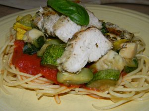 A couple of weeks ago I posted some pictures on my facebook wall of a meal I made which I called “Summer Supper.” The pasta dish was invented by my sister. Not only is it delicious, but you can easily adapt it to suit your tastes. Here are the recipes: